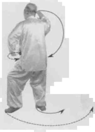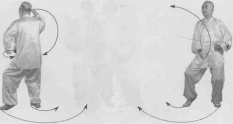 身体快速左后转,胸向南眼看右掌。左脚顺缠撤步右脚逆缠先上步里蹑转,重心编右腿。左拳顺缠右搦转拳心向上右掌顺缠左例转掌高与眼同掌心向左。(图2-42-1)