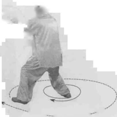 身体右周转胸向东眼看左拳。左脚逆缠脚跟里侧贴地,向右扫一周右脚顺缠外踝转重心偏右腿。双拳顺缠右搦转。(图2-49-3)
