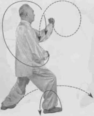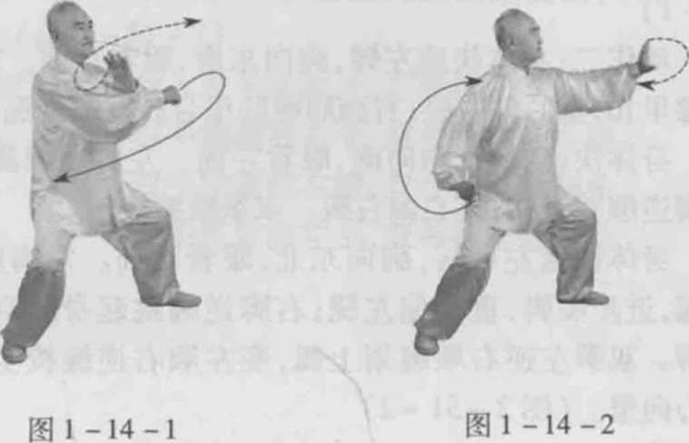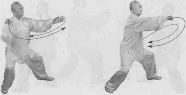 动作一身体左转,胸向西眼看右拳。左脚逆缠膝里扣右脚顺缠膝里合,重心偏右腿。左拳逆缠捋转右拳逆缠搠转。