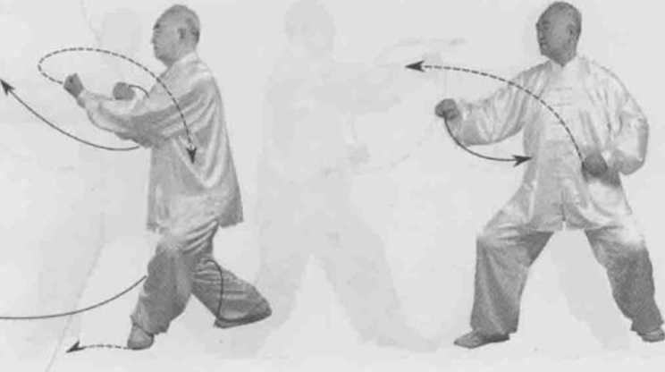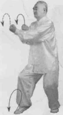 动作一身体左转,胸向东眼看右拳。左脚逆缠膝里扣右脚顺缠膝里合,重心偏右腿。左拳逆缠捋转右拳逆缠搠转。