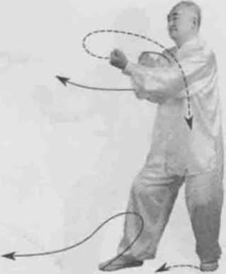 身体右转,胸向西眼看左拳。左脚逆缠上步重心偏左腿右脚顺缠外跟转。左拳顺缠向胸前搠拳心向上右拳顺缠捋至左肘上拳心向上。(图2-57-1)