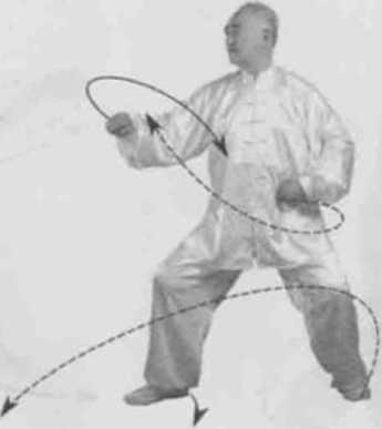动作一身体左转,胸向南眼看左侧。左脚顺缠向后勾踢右脚