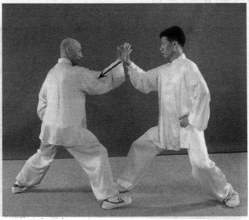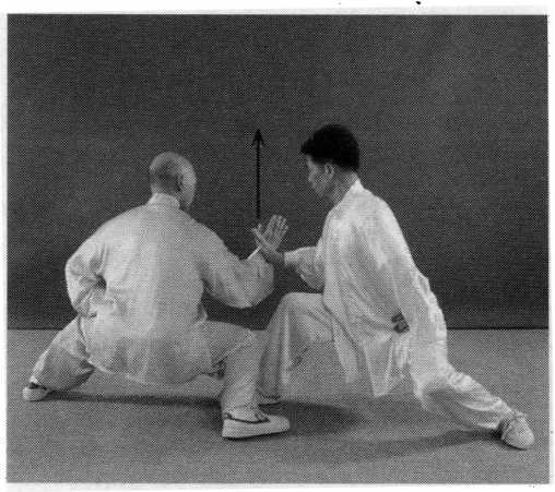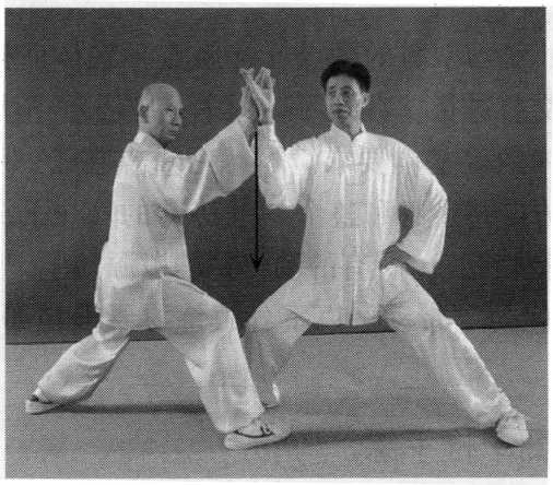 动作二:乙方主动下沉,右手下按;甲方随之下坐,右手下引 (图 8-1-8)。