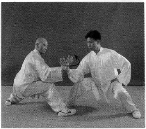 甲、乙双方两脚前后开立,身体略下坐,左手叉腰,右手互搭 (图 8-1 -6)。