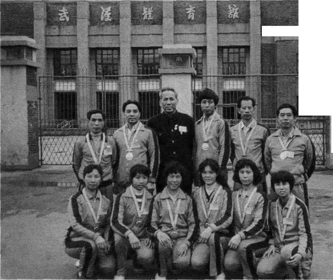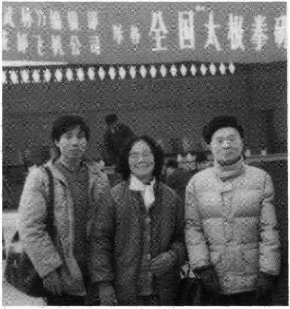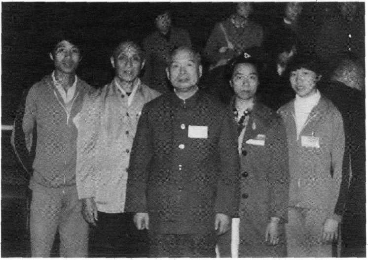 图3-1 -3 1984年4月参加武汉国际太极拳(剑)比赛后合影 自左至右为:罗红元、罗基宏、顾留馨、顾留馨的侄女、古岱娟