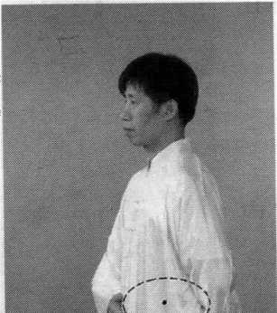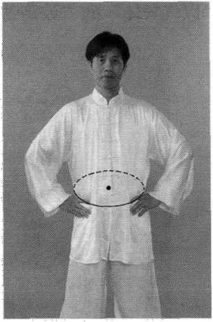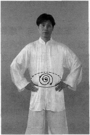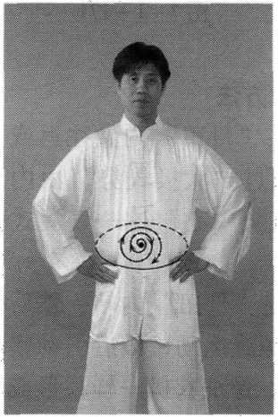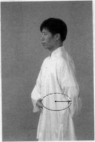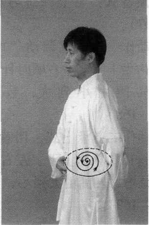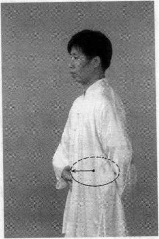 动作四:承上式,调动“内气”在“丹田”内做前后、左右 逆时针方向转圈练习,转圈由大到小,数量不限(图