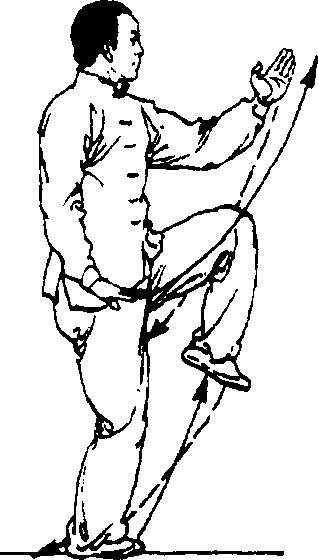 内侧后方,重心后移;上体左转, 右腿屈 ,脚尖下垂,左腿微 屈站稳,成左独立步;左掌翻转按 于左胯旁,右掌成侧立掌挑至体 前,指尖高与眉齐;目视右掌。(图