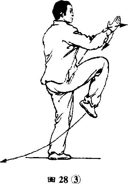 ②重心前移,上体右转,左腿 屈膝向前上提起,脚尖下垂,舟 微屈站稳,成右独立步;左勾手变 掌,经体侧向前、向上挑起,成侧 立掌,指尖高与眉齐,右掌翻转下 按于右旁;目视左掌。(图28 ②)