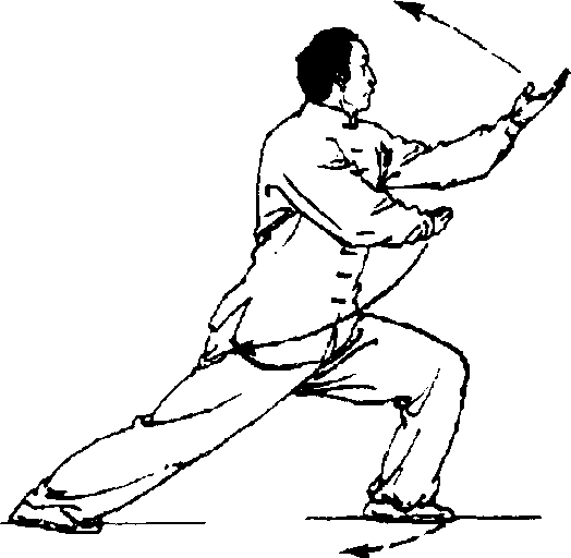 尖外展,左脚尖内扣,右腿屈弓, 左腿自然蹬直;右掌向上挑至体 前,成侧立掌,腕高与肩平,左臂