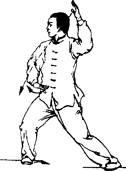 ① 左腿稍屈,右脚后撤一步, 右腿自然蹬直,左腿屈弓,左脚以 前脚掌为轴顺势扭正,成左弓步; 左臂外旋,左掌翻转,掌心向上, 收经腰间,从右前臂上穿出,腕高 与肩平,右臂内旋,横掌下按,落 于左肘下方;目视左掌。(图29)图30①