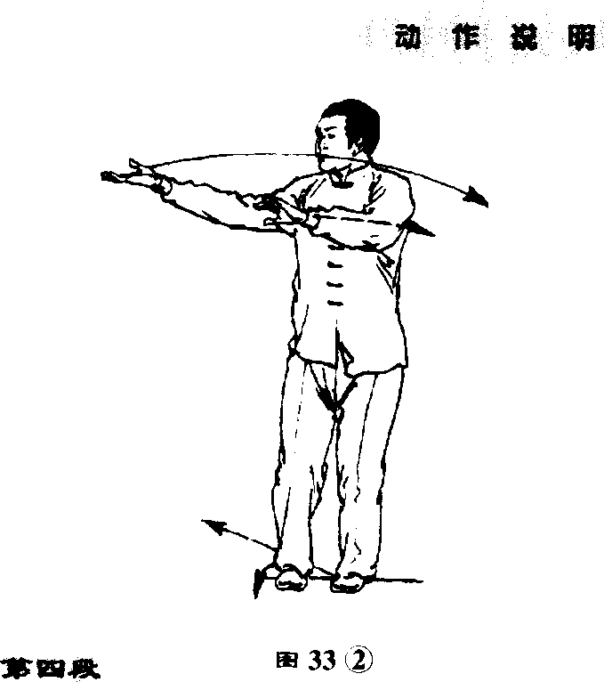 ①重心后移,左脚尖外撇抬 起;左拳变筝,左臂外旋,右普内 旋,两掌心同时转向外,并微向后 收带;目视两掌。(图33①)