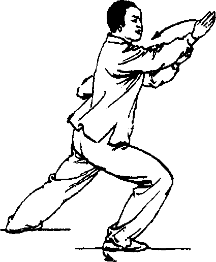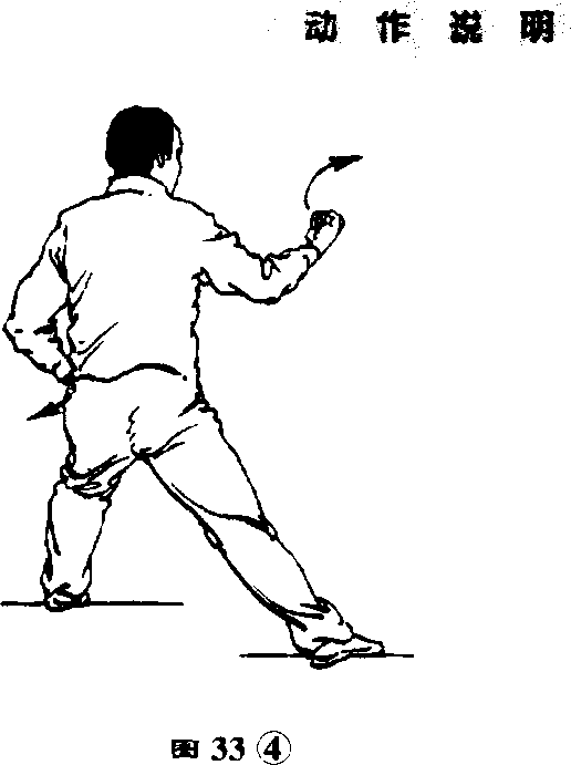 ④ 上体继茹转,重心左移, 右脚耐圈右眼自然蹬直,成左 侧弓步(横裆步);两掌向左平捋> 逐渐握拳,左臂外旋,左拳向左划 弧,卷收于腰间,拳心向上,右臂 屈肘外旋液压置于体前,右拳高 与胸齐,拳心斜向上;目视右拳O (图33④)