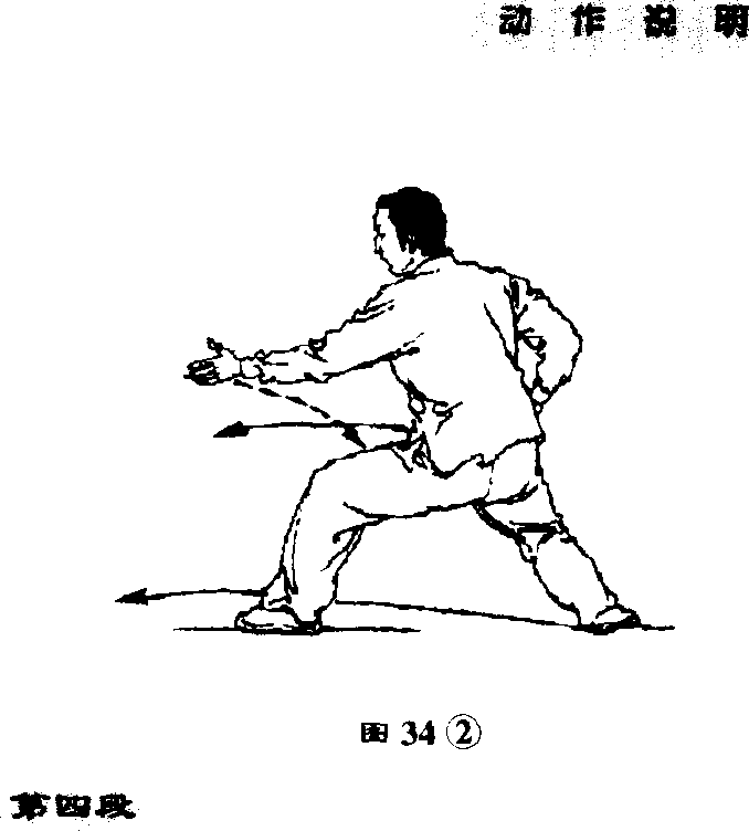 拳心向外,左臂内旋,左拳向身体 左后方穿出,拳心向后;目视前