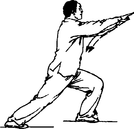 ⑧ 重心前移,成左弓步;双 臂向前挤出,两臂撑圆,右掌指 附于左腕内侧,高与肩平;目视 左前臂o (图40⑧)