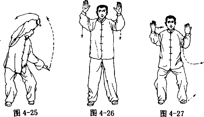 ① 开步举臂 两膝微屈,上体微左转;左手下落,臂外旋,手 心向外,随转体向左划弧至左胯旁;接着上体右转(胸向南),两腿 伸起;随转体左手向上、向右举至额的左前方;同时,右手举至额的 右前方,两手均向前,两臂微屈;眼平视前方(图4_25、4-26)。