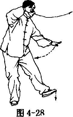 ① 转身提按 左脚碾转,脚跟内收后再向左前方上步,脚跟 着地,脚尖翘起;同时,上体左转;左手内旋,手心翻转向下后再继 续经下向左划弧搂于左膝前方,手心向下,指尖向前;右手屈腕内 旋置于右耳侧,手心向里,指尖向前;眼看左手(图4-28)。