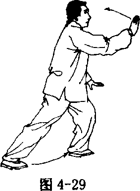 ② 弓步搂推(左) 左脚尖下落,全脚掌踏实;右脚跟外展, 重心前移成左弓步(胸向东);同时,右手向前推出,腕与肩平,手心 向前,手指向上;左手搂至左膝外侧上方;眼看右手(图4-29)。