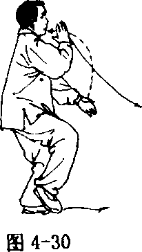 ② 屈膝垂肘 两腿屈膝下蹲;同时,两手臂外旋,两肘下垂, 手心翻转向里,腕与肩平;眼平视前方(图4-27)。