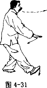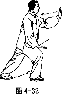 ③ 弓步搂推(右)重心移至左腿;右腿屈膝提起,经左小腿 内侧向右前方上步,脚跟着地;右手屈肘向左划弧至左肩前,再经 下向右搂按至右膝外侧上方,手心向下,指尖向前;左手经前向上 弧形提至左耳侧后再向前推出;腕与肩平,手心向前,指尖向上;同 时,右脚尖下落,全脚掌踏实,重心前移成右弓步;眼看前方(图4 -30 ?32)。