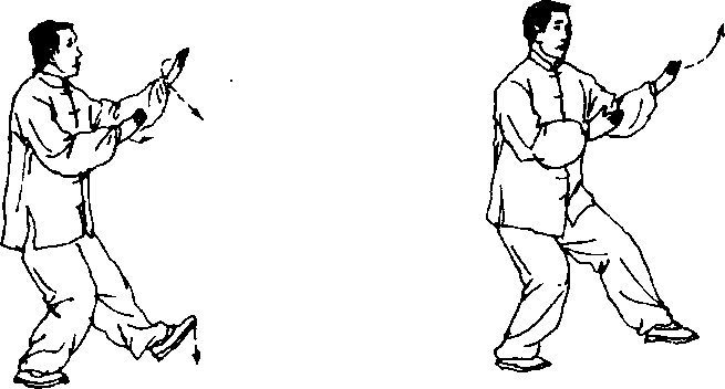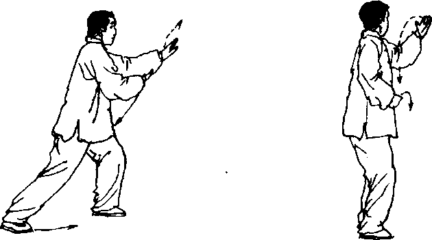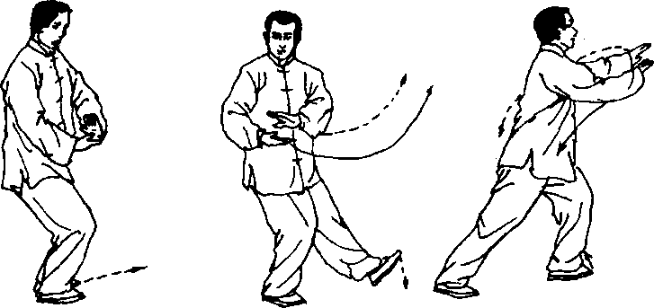 ② 图 4-40图 4-41图 4-42 弓步搬抹 重心移至右腿;左脚向前上步,脚跟着地,脚 尖翘起;同时上体微右转;两手随腰右移;接着,左脚尖落地,重心 前移成左弓步;随重心移动,上体左转(胸向东),两手一齐向左前 上方划弧置于胸前;眼看左手(图4-41、4-42)。