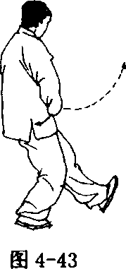 ③ 后坐回捋 右腿屈膝,重心后移,左脚尖翘起,上体微左 转;同时,两手一齐随转体向左、向下划弧至左腰前;左手心向下, 指尖向前?,右手心向上,指尖向左;眼看左手(图4-43)。
