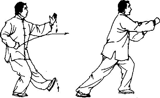 ② 弓步前推 左脚尖落地踏实、重心稍前移;上体微右转; 随之左手内旋,手心向下;右手外旋,手心向上,两手一'齐经右向則