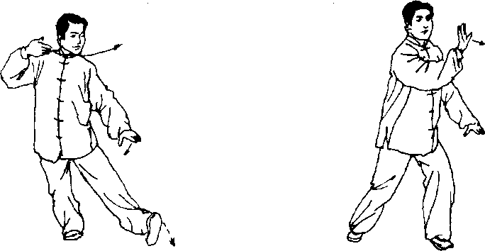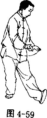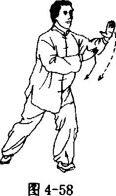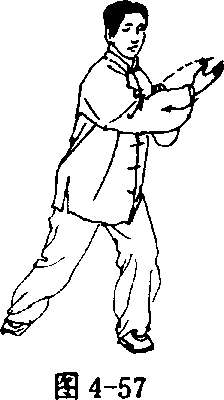 ② 图 4_55图 4-56动作与第(6)势“左搂膝拗步”基本相同,唯方向朝东南方; 步法略宽(图4-56)。
