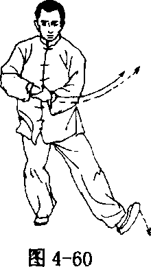 ④ 弓步前推 上体右转,左手外旋,手心向上;右手内旋,手 心向下附于左前臂内侧,随转体向右至腹前;接着左脚尖落地踏 实。重心左移成左弓步;上体随之左转;同时左手向右、向前、向左 划弧至胸前,指尖与鼻同高;眼看左手(图4-60、4-61)。