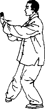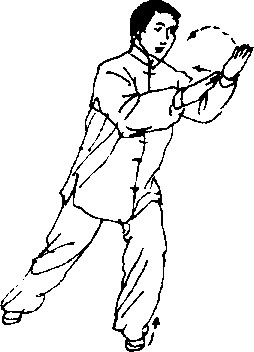 ② 整个动作过程中,始终保持头的领劲及身体松沉,扣脚转身 时意想身体内有一根中轴,绕轴转动。