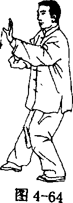 (图4—62?64)所示运动方向,从(图4—61)动作所7FC的东南 方向走外弧运动至东北方向,再右转至正西,不停地再向左转约 45度(西南),推按出左手,腕与肩平,平心向前,指尖斜向上;眼看 左手。