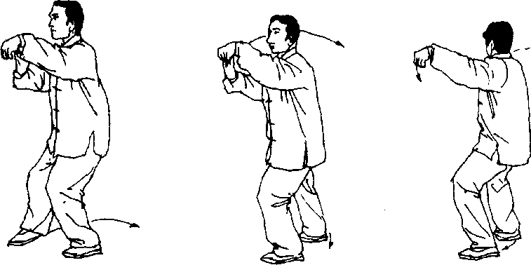 ① 弓步搂抹 以右脚掌为轴,脚跟内收;上体右转;同时右