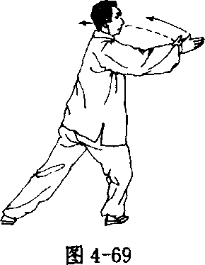 手内旋,手心向外,指尖向前,随转体向右划弧平搂;接着,身体继 续右转(胸向东),左脚向左前方(向西)上步;左勾手变掌向下、向 右、向前上方划弧至胸前,同时右手外旋,掌心向左,两手平举于体 前,手心相对,与肩同高、同宽,指尖均向前(正东);眼看前方(图4 -68、4 - 69)。