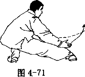 腕与肩平;接着,左腿屈膝全蹲成右仆步;上体随之右转,两手先下 按,经腹前沿右腿内侧前穿,右手穿至右踝处;左手穿至右膝内侧, 拇指侧均向上,眼看右手(图4-70、4-71)。