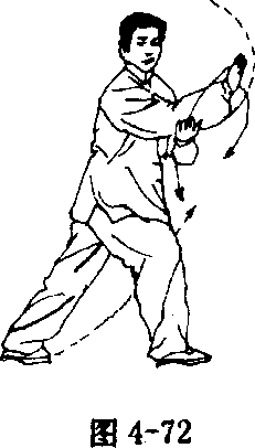 弓步前穿 左腿蹬伸,右腿屈膝前顶,重心逐渐前移,右 脚尖外摆,身体随之右转,屈膝成右弓步;右手随身体移转向前、向 上穿至胸前时变手心斜向下;左手相随穿至右肘下,手心向上?,眼 看左手(图4-72)。