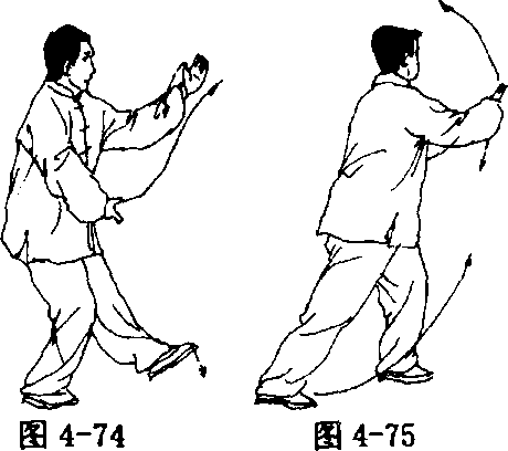 弓步劈穿 右腿屈膝;左脚向左前方落步,脚跟着地,同 时左手向前外旋下落;右手外旋,手心翻向上;接着,左腿屈膝,重 心前移成左弓步;上体随之左转(胸向东北);当左手下落至与肩同 高时,右手经左肘下沿左前臂外侧向前上方穿出,手心斜向上;左 手附于右前臂内侧,手心向下;眼看右手(图4-74、4-75)。