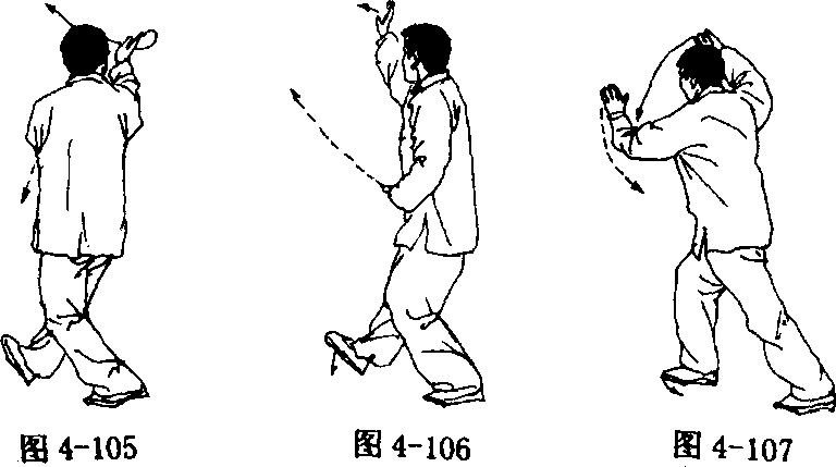 ③ 后坐旋架 左腿屈膝,重心后移;右脚尖翘起;上体右转; 随之右手屈臂向右旋腕,至肩右前上方,手心斜向上;接着,上体左 转,右手再内旋屈肘上举至右额前;左手收于左腰间,手心向上;眼 随视右手,最后看右前方(图4- 105、4- 106)。