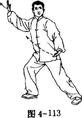 腕略高于肩;右手向下、向左划弧落于右胯旁(图4-118)。