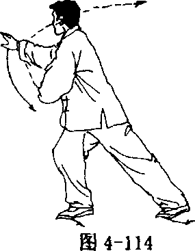 手经体前向下划弧落于左胯旁,手心斜向下;眼看左前方;动作不 停,上体右转(胸向西南),随之右手内旋,手心翻向下,向右前方伸 出;左手外旋,手心向上,经腹前向右上方划弧至右肋前;眼看右手 (图 4-113、4-114)。