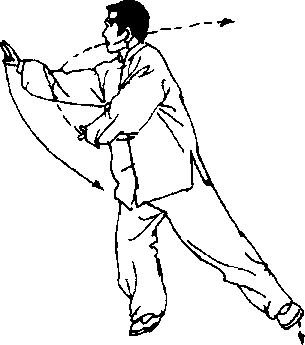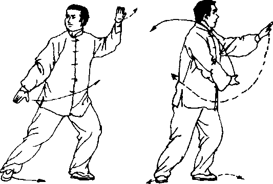 脚尖内扣,与右脚平行;身体随之右转(胸向西南)成右横弓步;同 时右手微外旋,随转体向右平摆举于右肩前上方,腕略髙于肩,左