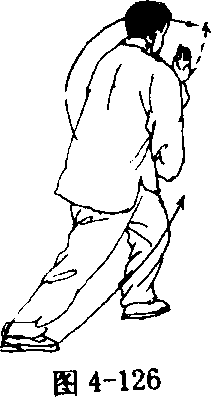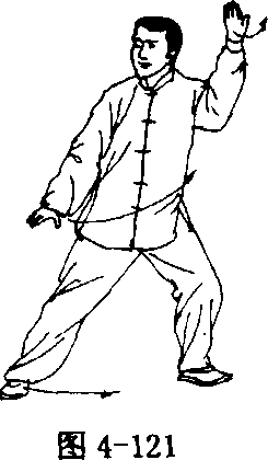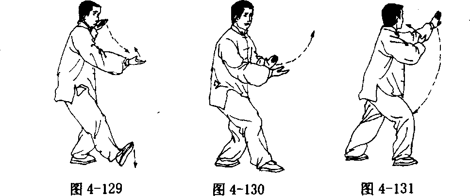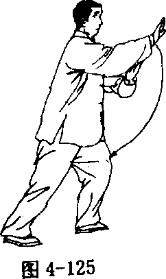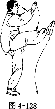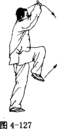 臂向左、右分开,右手与右脚方向一致;左手落于体左侧,腕略高于 肩;眼看右手(图4 - 127、4 - 128)。