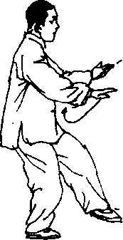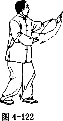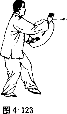 步;上体微左转(胸向东),随转体右手向左手方向推出,手心向左 前方,腕与肩同高;左手收落至腹前,手心向上,指尖斜向前;眼看 右手(图4- 123)。