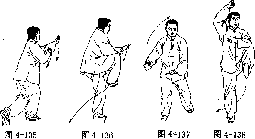 ① 提膝合按 右腿屈膝下蹲;左脚屈膝向右后方落步;左手 稍向右合;右手向左合至左肘关节内侧;动作不停,左脚跟落地踏 实,重心移至左腿;右腿屈膝提起;同时两手变掌掌心向下降至腹 前;眼看左手(图4- 135、4- 136)。