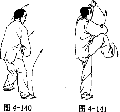 ④ 提膝抱架 左脚跟落地踏实,左腿屈膝,重心慢慢后移; 同时上体左转成左弓步;随转体两手向下、向左分别捋至左膝两侧 前上方,手心向下,虎口相对;接着左腿伸膝;右腿屈膝提起,膝外 展,脚尖翘起向上;同时左手变拳屈肘架于左额前上方,拳心向外, 拳眼斜向下,右手变拳屈肘横置于左胸前,拳眼向上;眼看前方(胸 向东北)(图 4-140、4_141)。