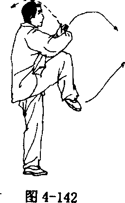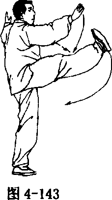 两拳变掌,左手向下,右手向上在胸前相合搭腕,右手在外,手 心均向里;右脚尖先向下松垂;接着脚尖勾起,右腿由屈到伸,以脚 跟为力点,向右前方(东南)蹬出;脚高过膝;两手随蹬腿分别向上、 向两侧伸臂分展,腕高于肩;眼看右手(图4- 142、4- 143)。