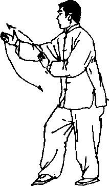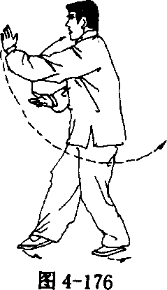 ① 转身提按 右脚跟落地踏实,脚尖内扣,重心渐移至右 腿;左脚尖外摆;身体随之左后移(胸向东南),脚尖翘起;随转体左 手向下、向左后方划弧搂至左膝前上方;同时右手外旋屈肘上提至 右耳侧,手心向内(图4一177)〇