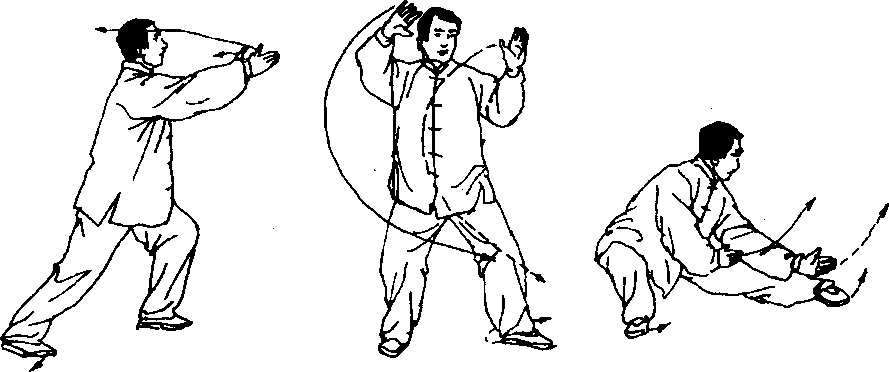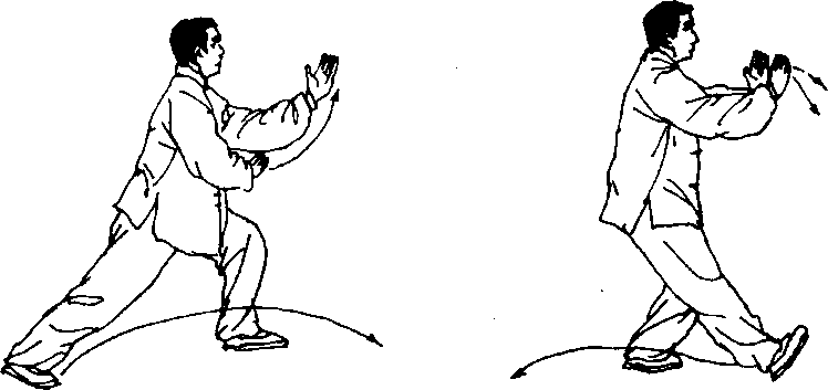 ① 弓步前穿 重心慢慢前移成弓步;上体微左转(胸向东);