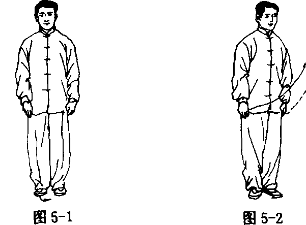 ③ 扣脚转体时,两胯根微内微,从头顶“百会”到脚底似有一立 轴,右半侧身体以此为轴自然扣右脚半面左转。