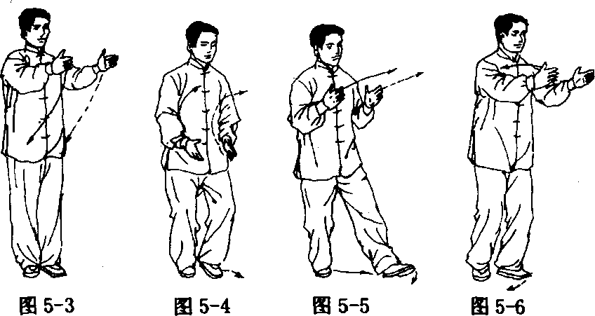 ⑤ 上步收掌 右手向右、向后划一半圆,前臂内旋屈肘,手 至右肩前,手心由斜向上转向前,左手仍扶着右腕;同时,右脚向前 上一步,脚跟着地,脚尖翘起,眼看右手(图5-9)6