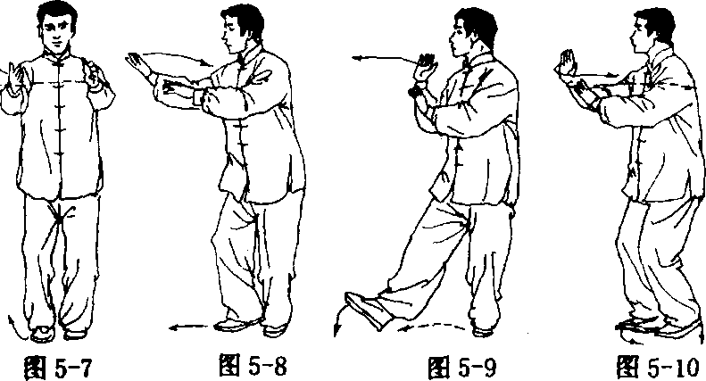 ④ 转体平摆 右脚跟落地,重心偏向右腿,左脚以脚跟为 轴,脚尖右转约45度;同时身体右转(胸向南),随之两手臂平行右 摆;接着重心移向左腿,右腿外摆约90度;同时身体继续右转(胸 偏向西南);两手随体转摆至右前方时,右手外旋,手心向上,左手 内旋,手心向下,置于右手腕上,眼看右手(图5-7、5-8)。