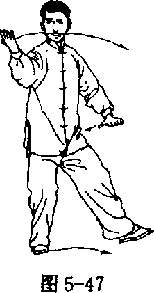 ① 迈步搂手 左脚向左后方迈,脚跟着地;身体微左转,同 时左手向下、向左搂至左胯旁(指距胯10厘米),右手外旋上举至 与肩同高,手心向上;眼看右手(图5-47)。